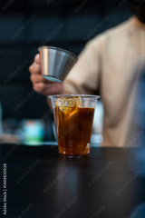 Closeup Barista hands pouring espresso shot to cup with cool water and ice making iced black coffee or iced Americano coffee
