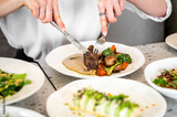 A close-up of hands cutting a piece of meat with a knife and fork on a plate, accompanied by vegetables and sauce. Additional dishes are visible on the table.