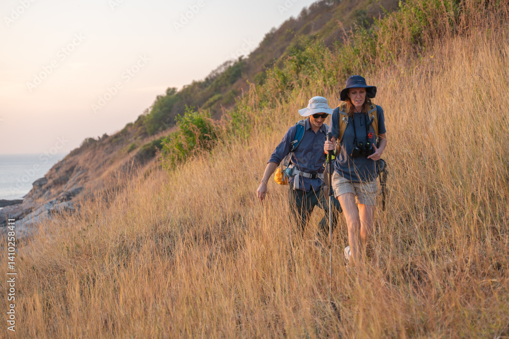 Hikers or explorers on journey carrying backpack, trekking poles looks into the distance observing and possibly guide trekking and trail exploration holiday ecotourism concept.