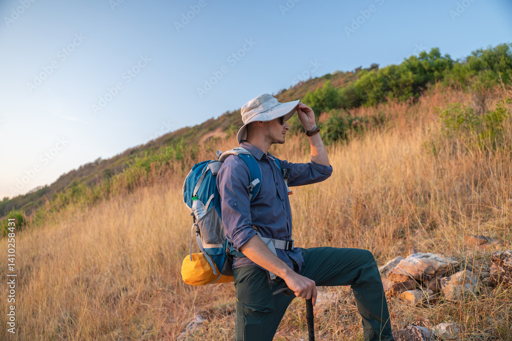 Hikers or explorers on journey carrying backpack, trekking poles looks into the distance observing and possibly guide trekking and trail exploration holiday ecotourism concept.