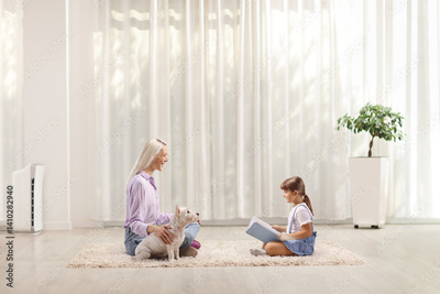 Woman sitting on a carpet with a westie terrier dog and a girl