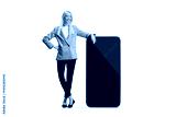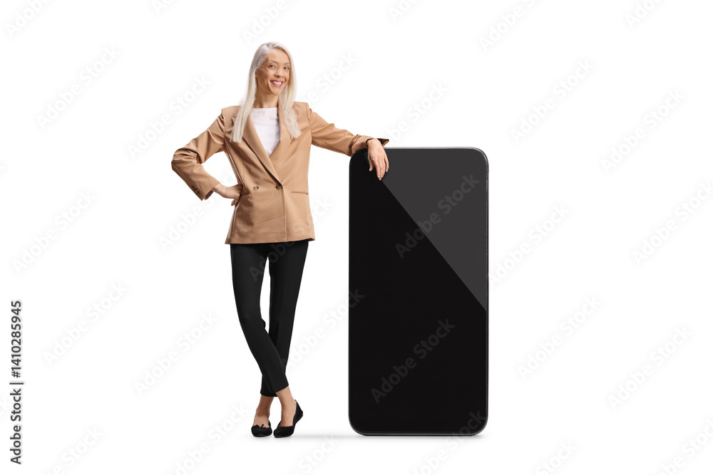 Young tall woman leaning on a big mobile phone