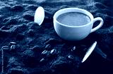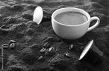 Espresso cup on ground coffee with capsules around elevated view