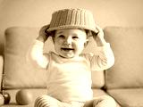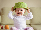 Happy baby girl plays with fruits at home