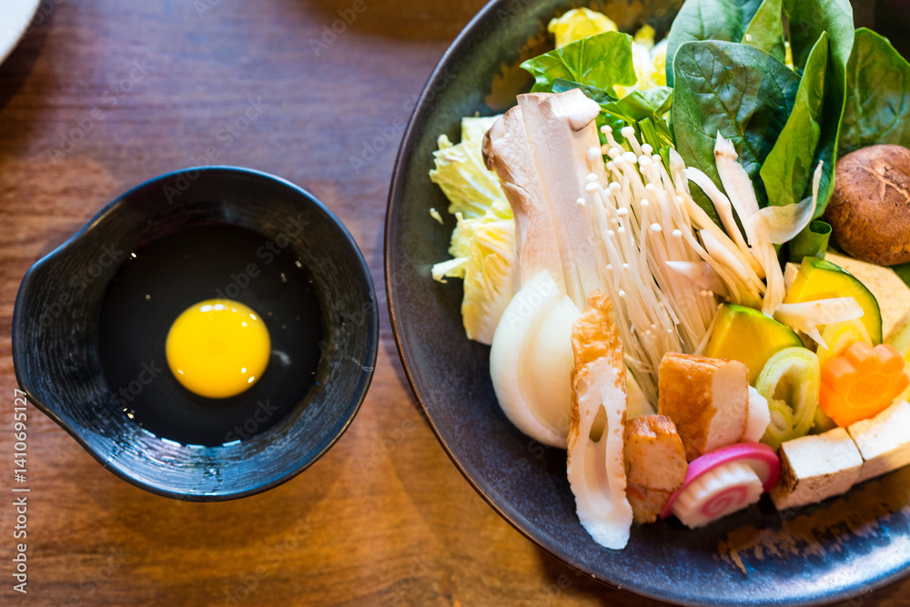Mixed fresh of vegetables for Shabu and raw egg ready to cooking. Top view