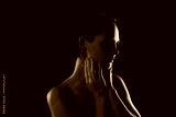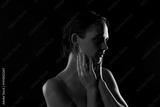 Photo of attractive sexy young woman touch skin look empty space neon red light shoulders off on black color background