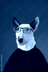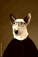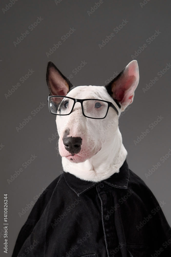 A white Bull Terrier dressed in a black shirt and glasses sits against a gray background, giving a scholarly look. The minimalistic studio setup highlights the dog's quirky and intelligent appearance.