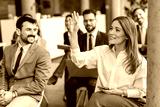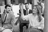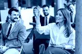 A businesswoman sitting at training room with hand raised and asking questions.