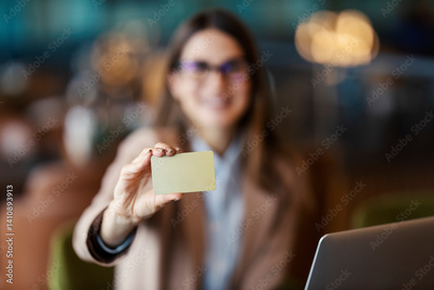 Close up of lady's hand holding her platinum credit card. E-commerce and online purchase concept.