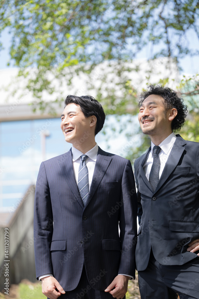 青空の都会ビル前で笑顔で未来や目標を見上げるサラリーマンクローズアップ 髭のミドル層の男性と若い男性の縦
