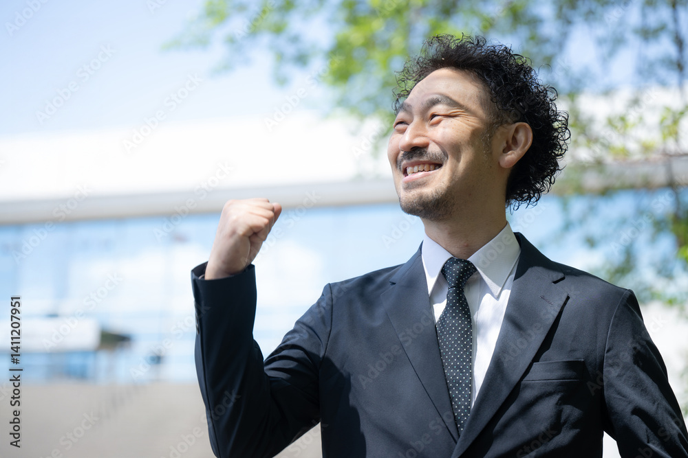 ビルと青空新緑背景でガッツポーズをする髭のビジネスマン