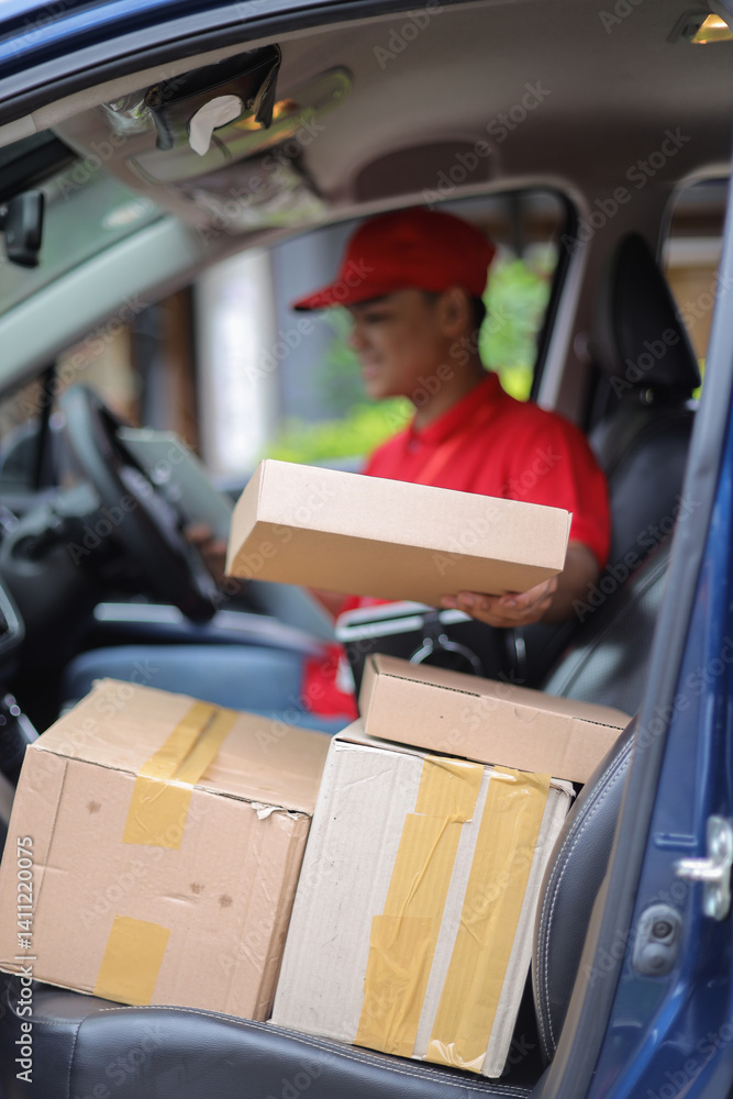 Young Courier Male Giving Parcels In Delivery Car