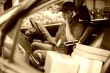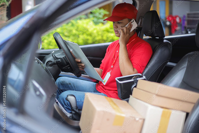 Urgent Courier Messenger Talking On The Mobile Phone While Looking List On Clipboard