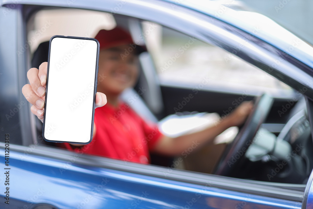 Selective Focus Of Mobile Phone With Blank Screen For Mockup Against Blurred Courier Male In The Car