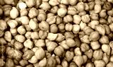 A small heap of brown chana on a pure white background. Dark brown, round, and slightly rough, with an earthy aroma and a nutty, hearty flavor.