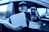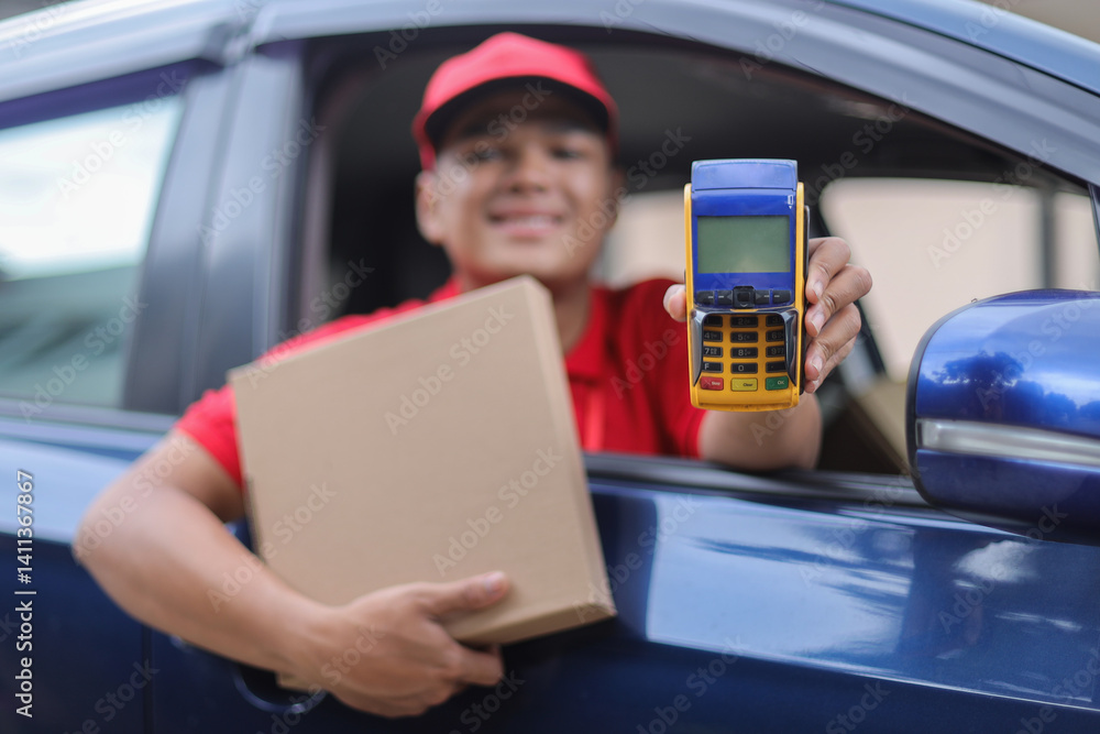 Deliveryman Inside The Car Smiling While Holding Package Box And Showing Machine For Cashless Payment