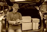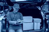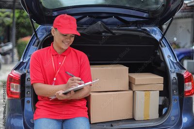 Positive Confidently Young Asian Delivery Male Writing On Clipboard While Sitting On Car Trunk