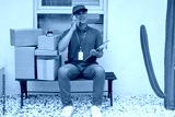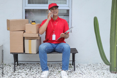 Asian Delivery Man In Red Uniform Sitting On Bench While Calling And Talking Using Mobile Phone