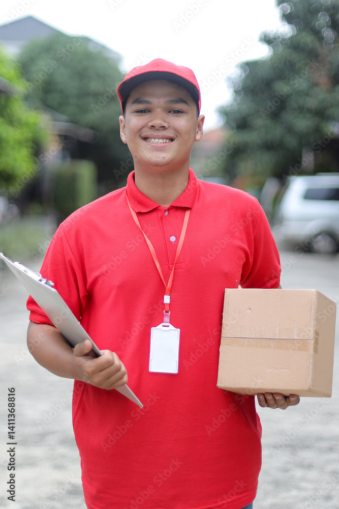 Cheerful Young Asian Delivery Guy Holding Clipboard And Cardboard Box While Looking At Camera
