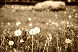 Several white dandelions with blurred dandelions and a big stone in the green grass. Blurred background with some colorful flowers.
