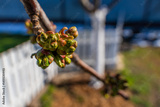 The first spring leaves and flower buds for blooming on a cherry tree branch