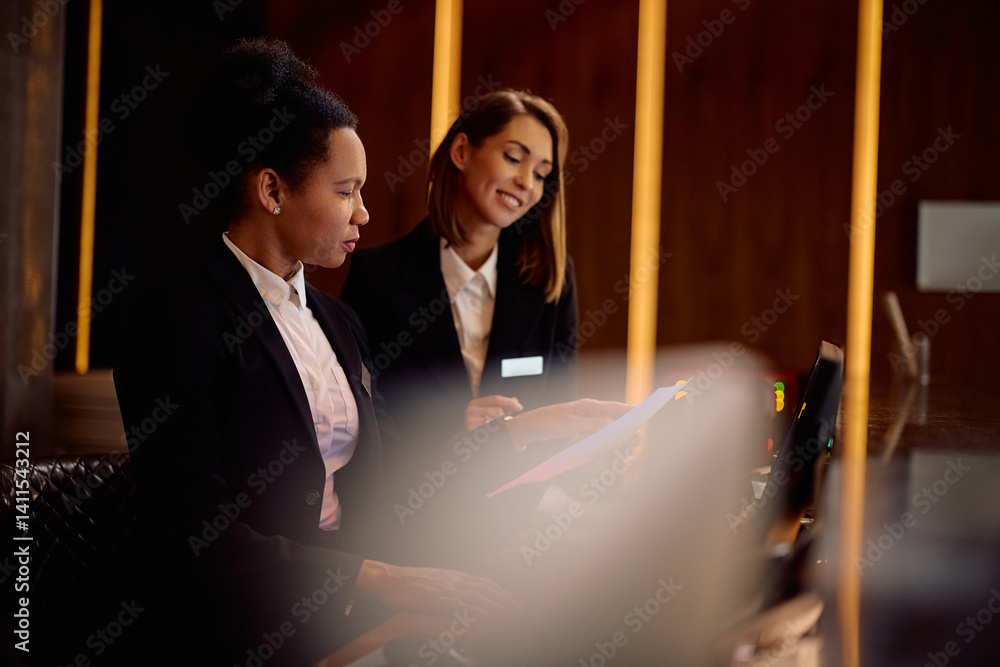 Female receptionists cooperating while working at front desk in hotel.
