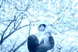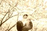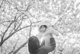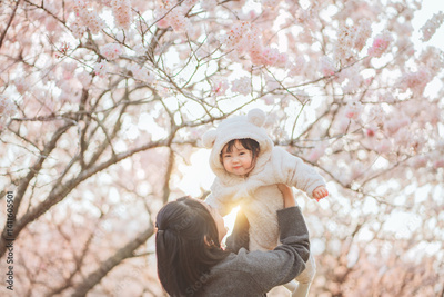 Happy little baby girl in her mother hands looking at camera and smiles over cherry blossom trees in sunlight morning, Family playing together outside, Newborn spring concept