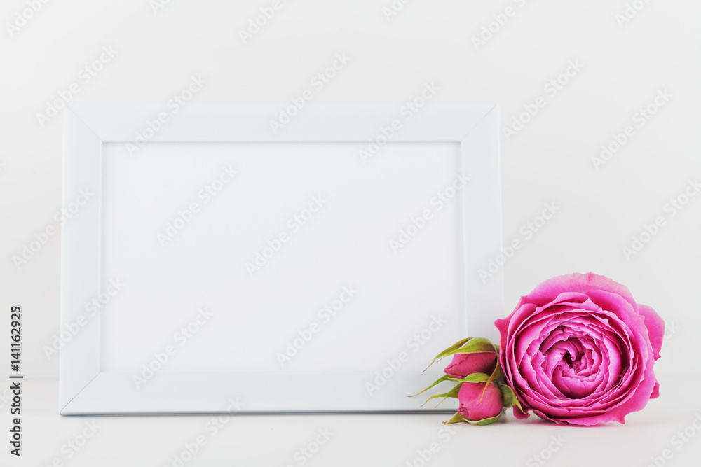Mockup of picture frame decorated rose flower on white desk with clean space for text and design your blogging.