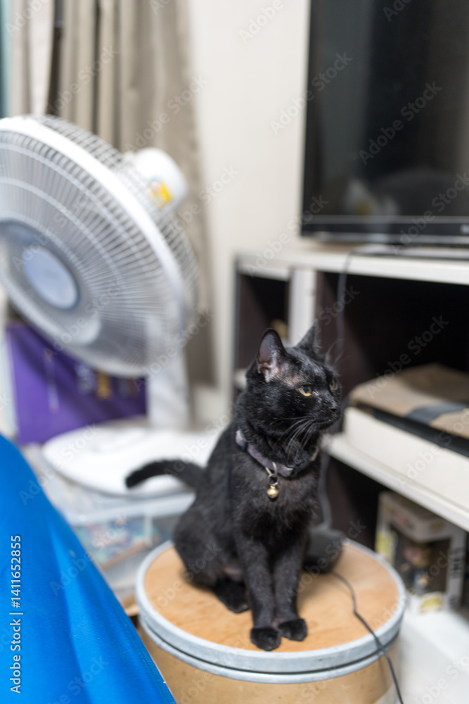 Closeup shot of mature pure black kitten shorthair pet cat on wooden table in bedroom