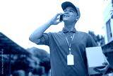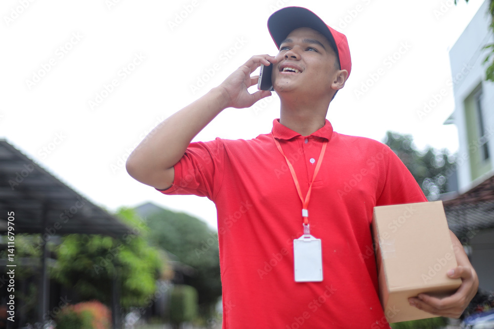 Attractive Young Asian Delivery Man Calling Using Cell Phone While Holding Parcel Outdoor