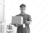 Portrait Of Cheerful Young Courier Man In Blue Uniform Offering Package And EDC Machine