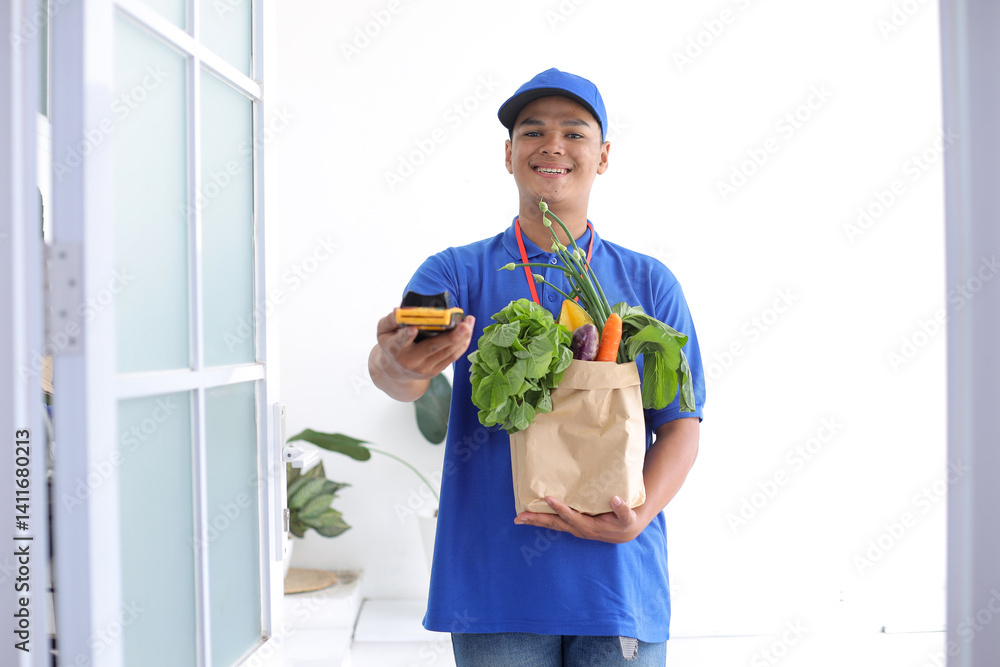 Positive Smiling Young Asian Delivery Man Holding EDC Machine And Paper Bag With Vegetables