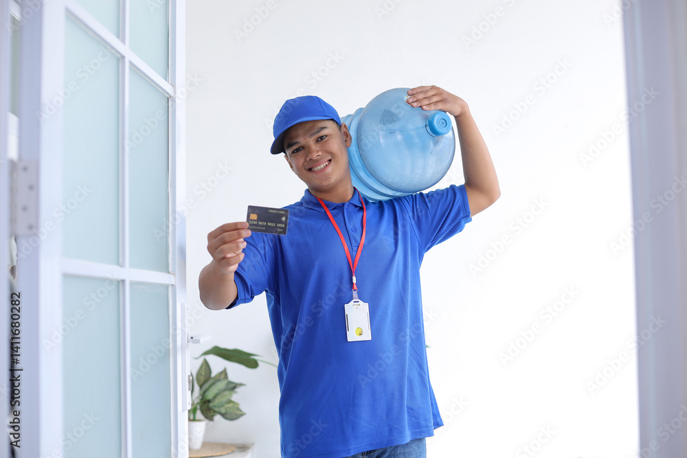 Happy Confident Young Courier Man In Blue Uniform Delivering Gallon While Showing Credit Card