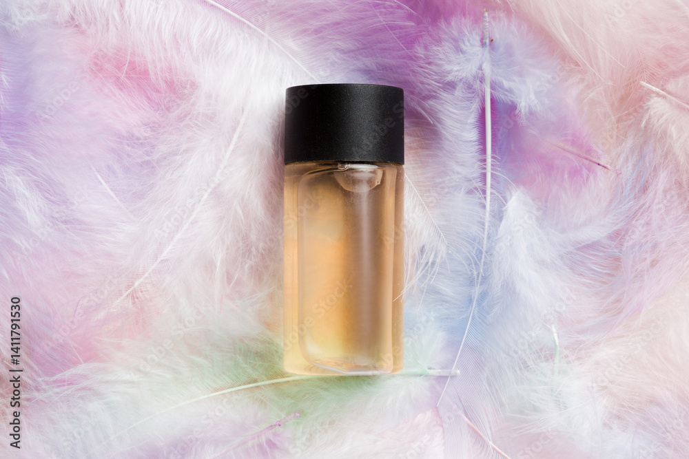 Spa cosmetic product, cream bottle, branding mock up, top view with feathers background. Flat lay