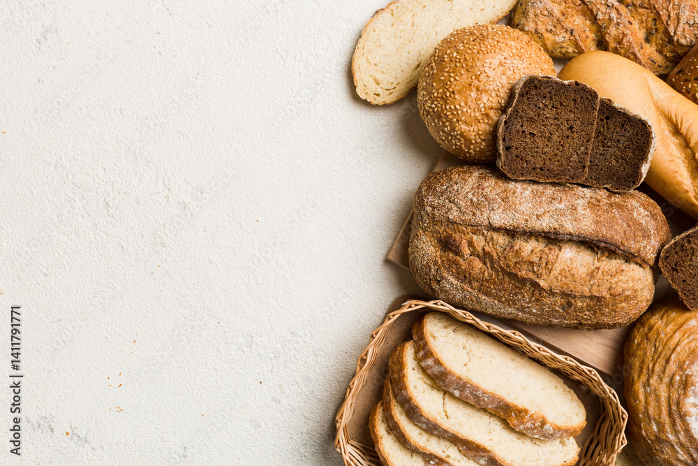 Homemade natural breads. Different kinds of fresh bread as background, top view with copy space