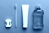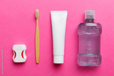 Mouthwash and other oral hygiene products on colored table top view with copy space. Flat lay. Dental hygiene. Oral care products and space for text on light background. concept