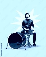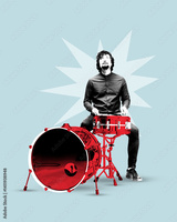 Man in dark shirt sitting behind bright red drums with burst background in creative art collage. Concept of music, jazz, festival, concert. Poster, ad. Photocopy effect
