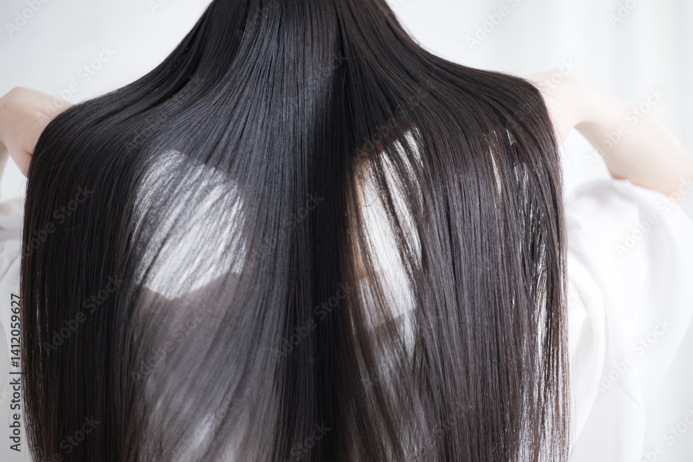 艶のあるロングヘアの黒髪の女性の後ろ姿の顔無し キューティクルな美しいストレートヘアの髪の毛 髪の毛を持ち上げる