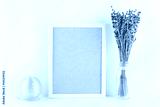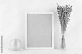 Mockup of picture frame decorated lavender flowers in vase on white working desk with clean space for text and design your blogging.