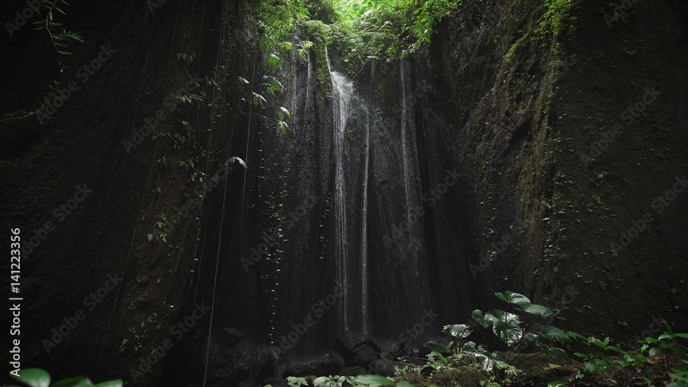 Calm view of a dark cave in the round hole of which falls down, the water which splashes falling on plants, blooming at the bottom