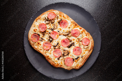 Fresh pepperoni pizza with melted cheese and mushrooms on a dark surface. Delicious!