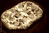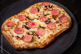 Freshly baked pizza features a golden crust adorned with savory pepperoni and mushrooms