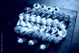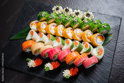A variety of sushi rolls displayed with creativity, emphasizing freshness and vivid colors