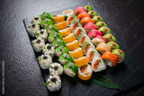 A colorful display of sushi rolls made with fresh ingredients and artistic flair