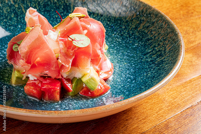 Beautifully arranged summer salad showcases prosciutto and fresh vegetables, perfect for warm days