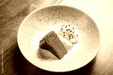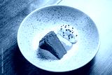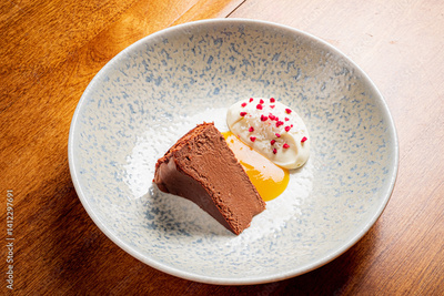 Indulge in a rich chocolate mousse topped with fresh cream and vibrant accents