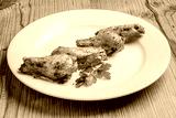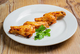 Delight in three perfectly cooked chicken wings served with vibrant parsley on a wooden surface