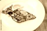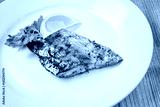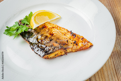 A grilled fish fillet sits elegantly on a white plate, garnished with lemon and parsley