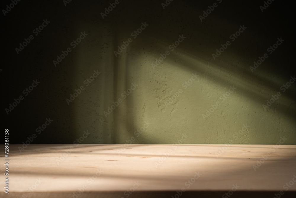 Modern empty room with sunlight and tree shadow. Interior background mockup with beige plaster wall and wooden floor. Minimalist living room scene.