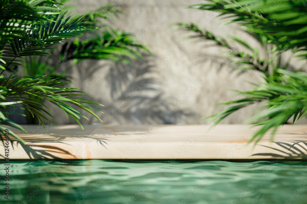 .Summer tropical background with luxury swimming pool edge and green palm leaves. Natural cosmetic, beauty, skincare, body care, health and spa product placement mockup. Nature aesthetic template
